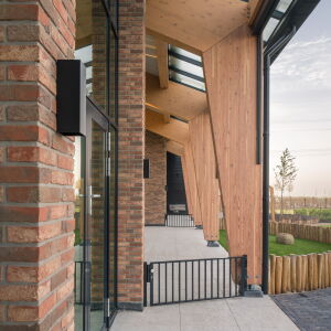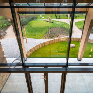 Dankzij de grote glasopeningen komt er volop daglicht binnen en hebben de kinderen een prachtig uitzicht op de boerderij en de dieren. Het binnen- en buitengevoel wordt op deze manier optimaal beleefd.